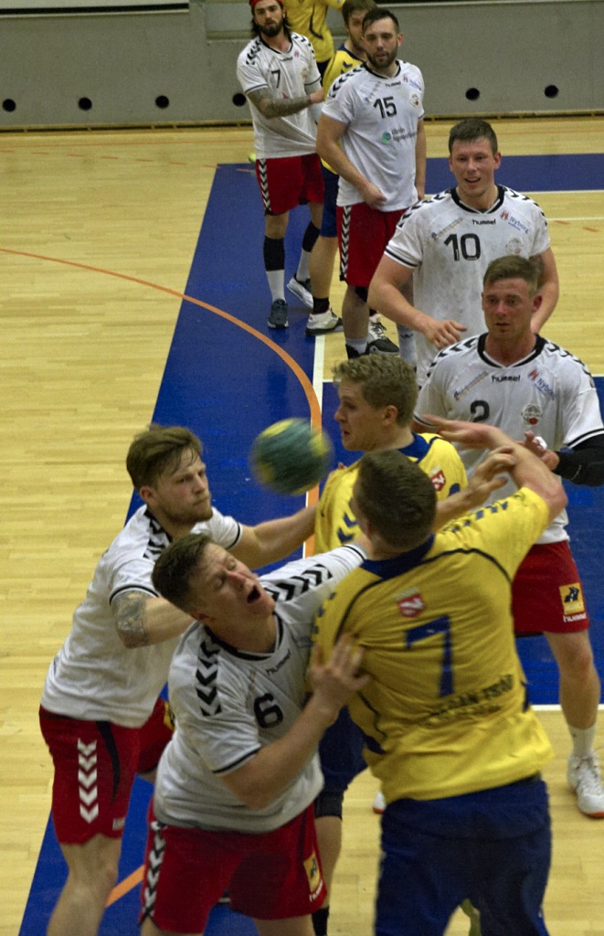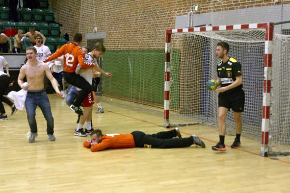 Efter nogle meget spændende slutsekunder i Vejlby-Risskov Idrætscenter i lørdag kunne juble bryde løs for SUS Nyborg-herrerne og de over 100 medrejsende tilskuere, da dommerne fløjtede af - og måltavlen viste 28-28. SUS Nyborg vandt som bekendt den første kamp i Nyborg med 33-31.