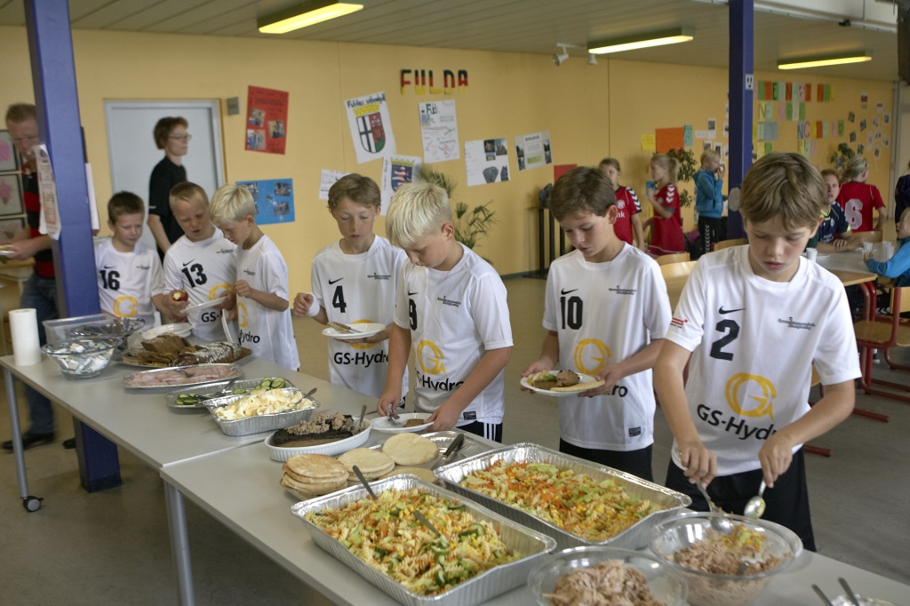 Efter aftensmaden for de omkring 850 overnattende spillere og ledere er der aktiviteter i hallerne og diskotek i gymnastiksalen i Ullerslev.